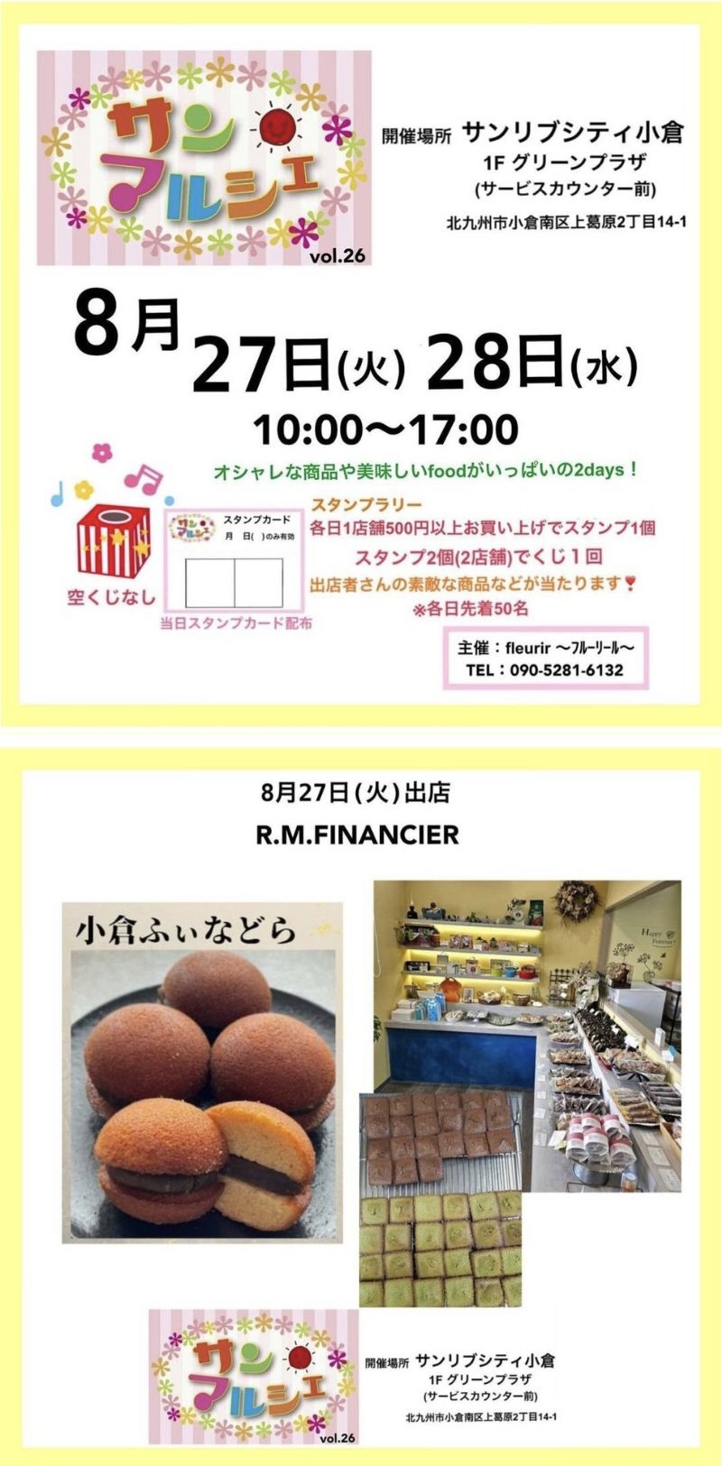 アールエムフィナンシェは8月27日(火曜日/10:00~17:00)サンリブシティ小倉1Fグリーンプラザにて”サンマルシェ”に初出店(※当店は27日のみの出店)いたします。”サンマルシェ”では美味しいfoodの他、おしゃれな雑貨など約25店舗が集まり当店は看板商品「小倉ふぃなどら」を始め、お客様の声に応えてついに単品販売開始した「フロランタン」他、人気の焼き菓子をたくさんご用意します。初の小倉南区出店。平日ではございますが皆様との出会いを楽しみにお待ちしております!