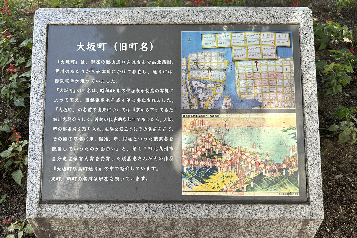 小倉駅前交差点にて信号待ちしながら、ふと見ると「大坂町(旧町名)説明碑」を発見しました。