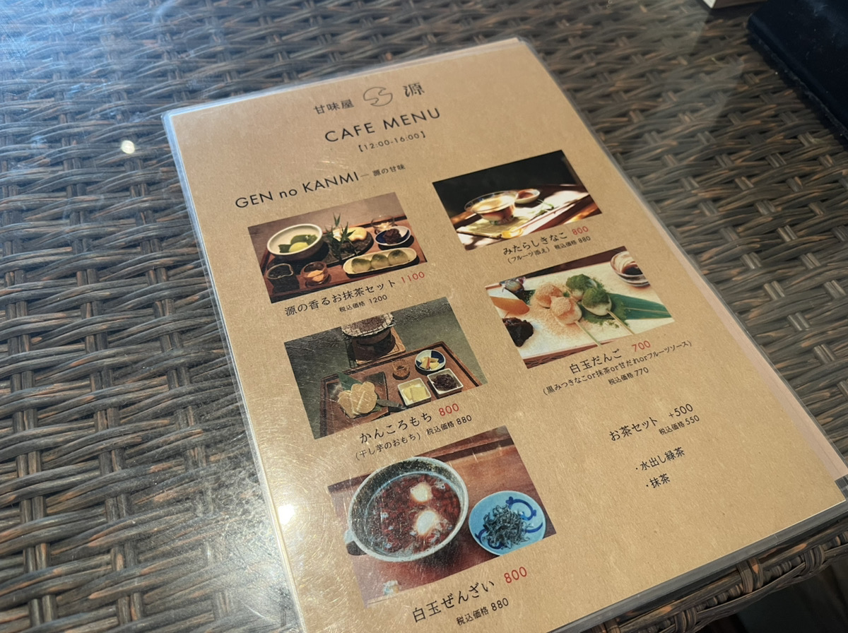 甘味は源の香るお抹茶セットやかんころもち、白玉ぜんざいなどがあり、プラス550円で「お茶セット」を追加することができます。