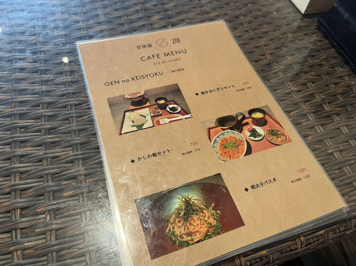 甘味だけでなく、焼きおにぎりセットやかしわ飯セット、明太子パスタなどの軽食メニューもあります。
