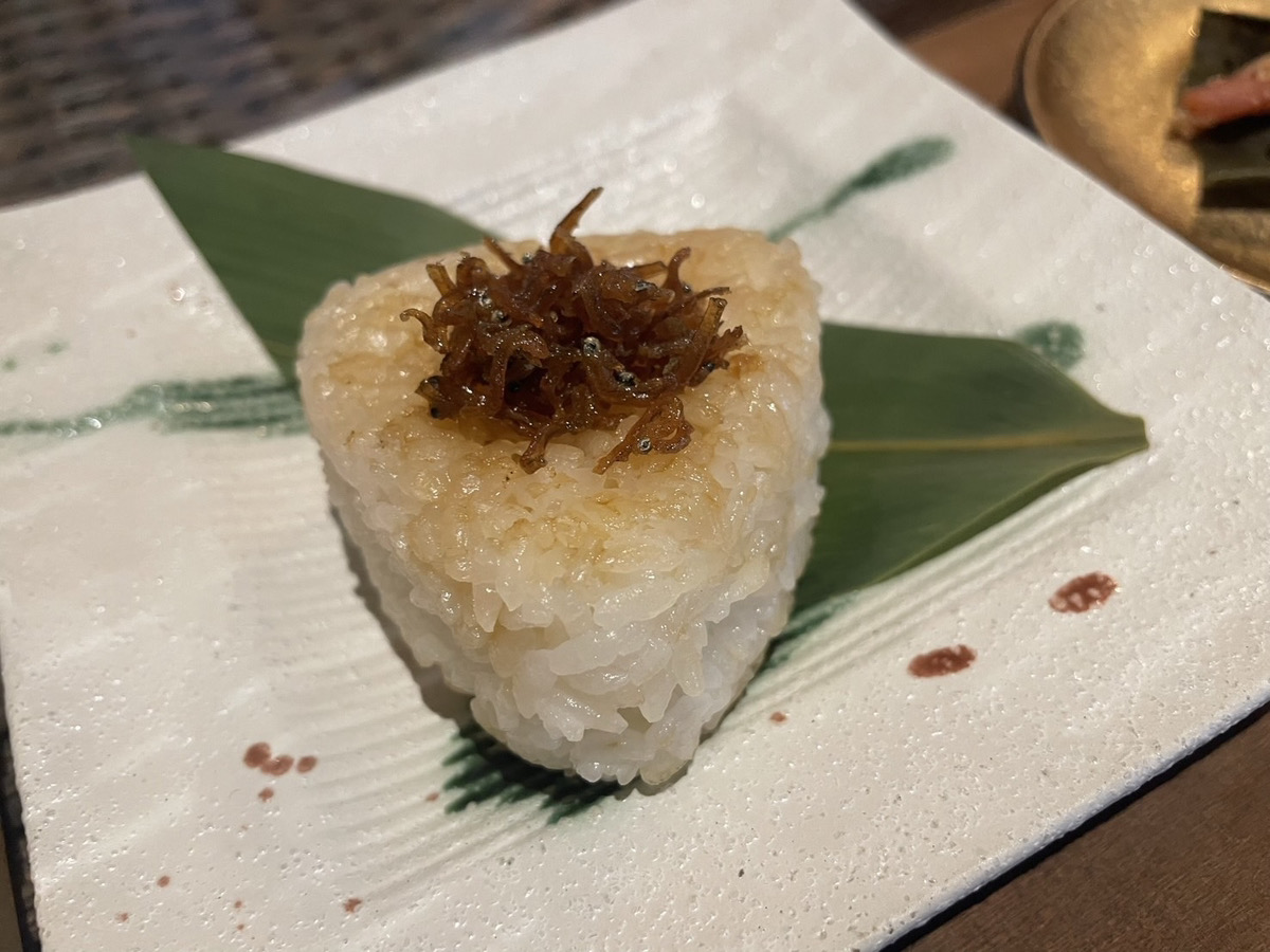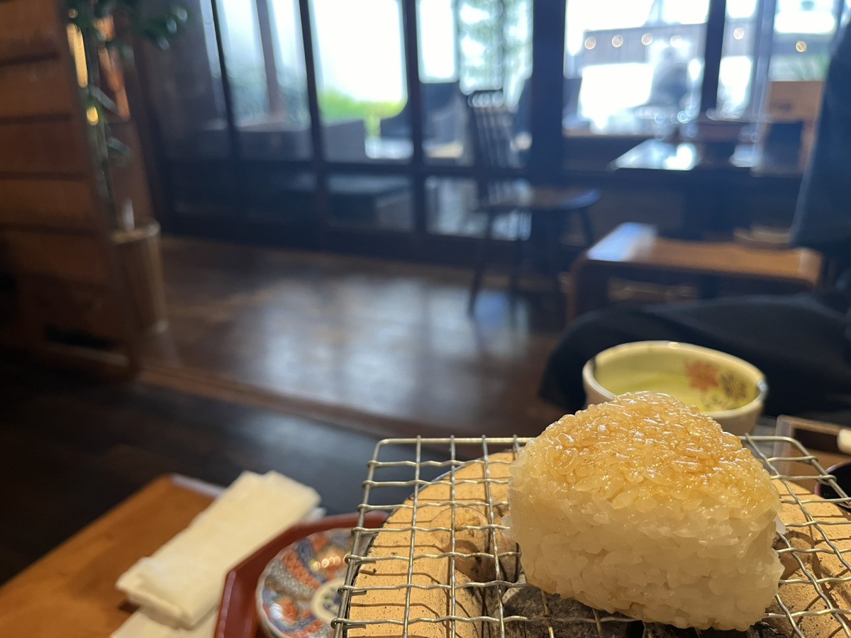 こちらは自分でおにぎりを炭火で焼くスタイルで、刷毛で醤油を塗りながら焼いていきます。焼いてる間も香ばしい香りが店内に漂います。