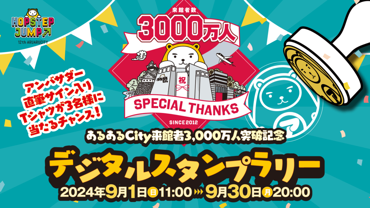 また、9月は「あるあるCity来館者3000万人突破記念月間」として、あるあるCity12周年公式アンバサダーで声優の金子有希さん、高田憂希さん、前田佳織里さんの直筆サイン入り記念Tシャツが当たる「デジタルスタンプラリー」など様々な企画を行われる予定です。