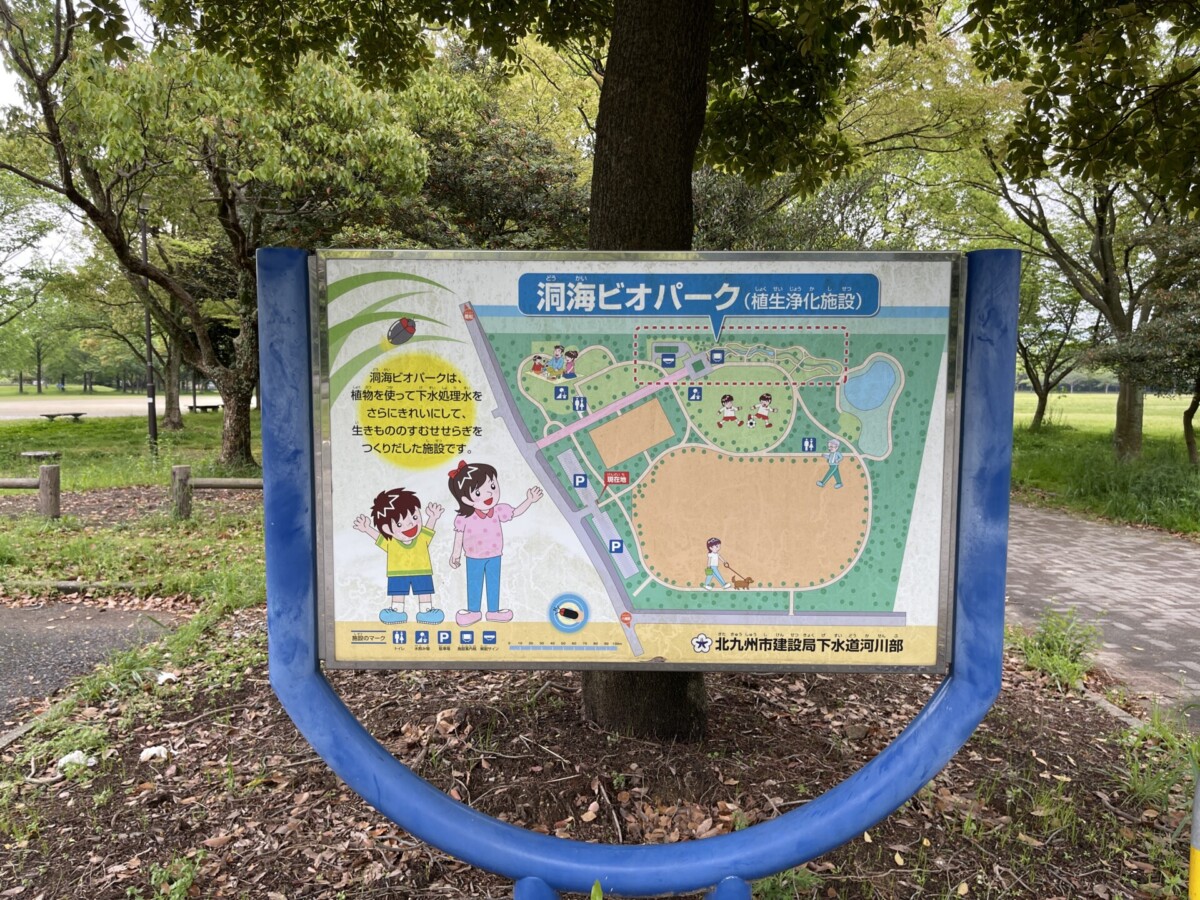 八幡西区と若松区の区境に位置する江川の側にある「洞北緑地公園」。芝生広場や遊具広場の他、植生浄化施設である「洞海ビオパーク」や「ドッグラン」なども設置された広い公園です。