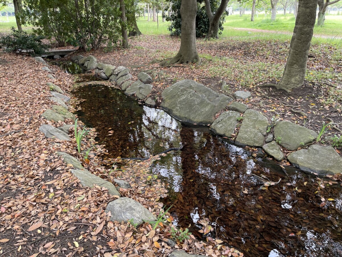 植生浄化ゾーンからせせらぎゾーンにきれいになった処理水が流れていくとのこと。この辺りは、水辺の生き物のすみかになるそうですが、この日は残念ながら生き物に出会えませんでした。