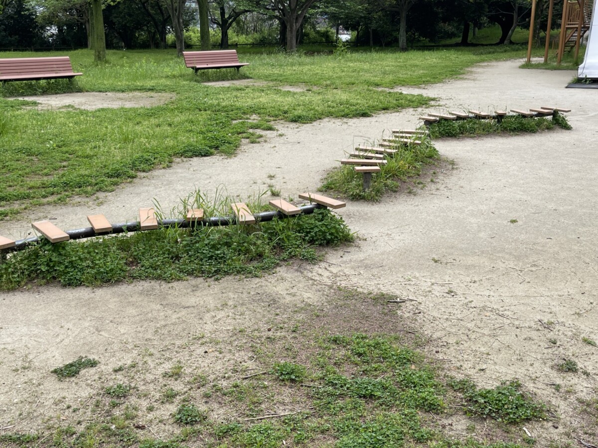 複合遊具のそばには、バランスをとりながら渡る線路のようなものもありました。