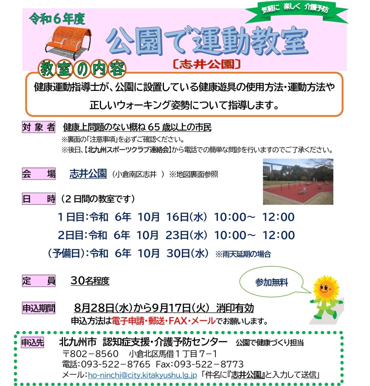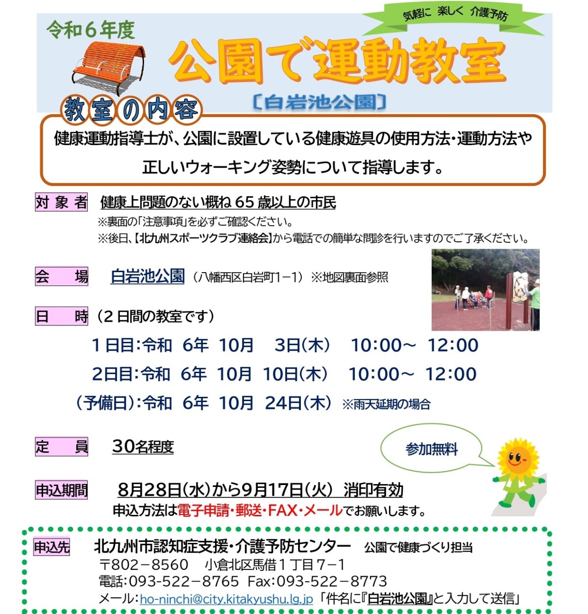 10月の各日程で、白岩池公園(北九州市八幡西区白岩町1-1)と志井公園(北九州市小倉南区志井)を会場に「運動教室」が開催されます。