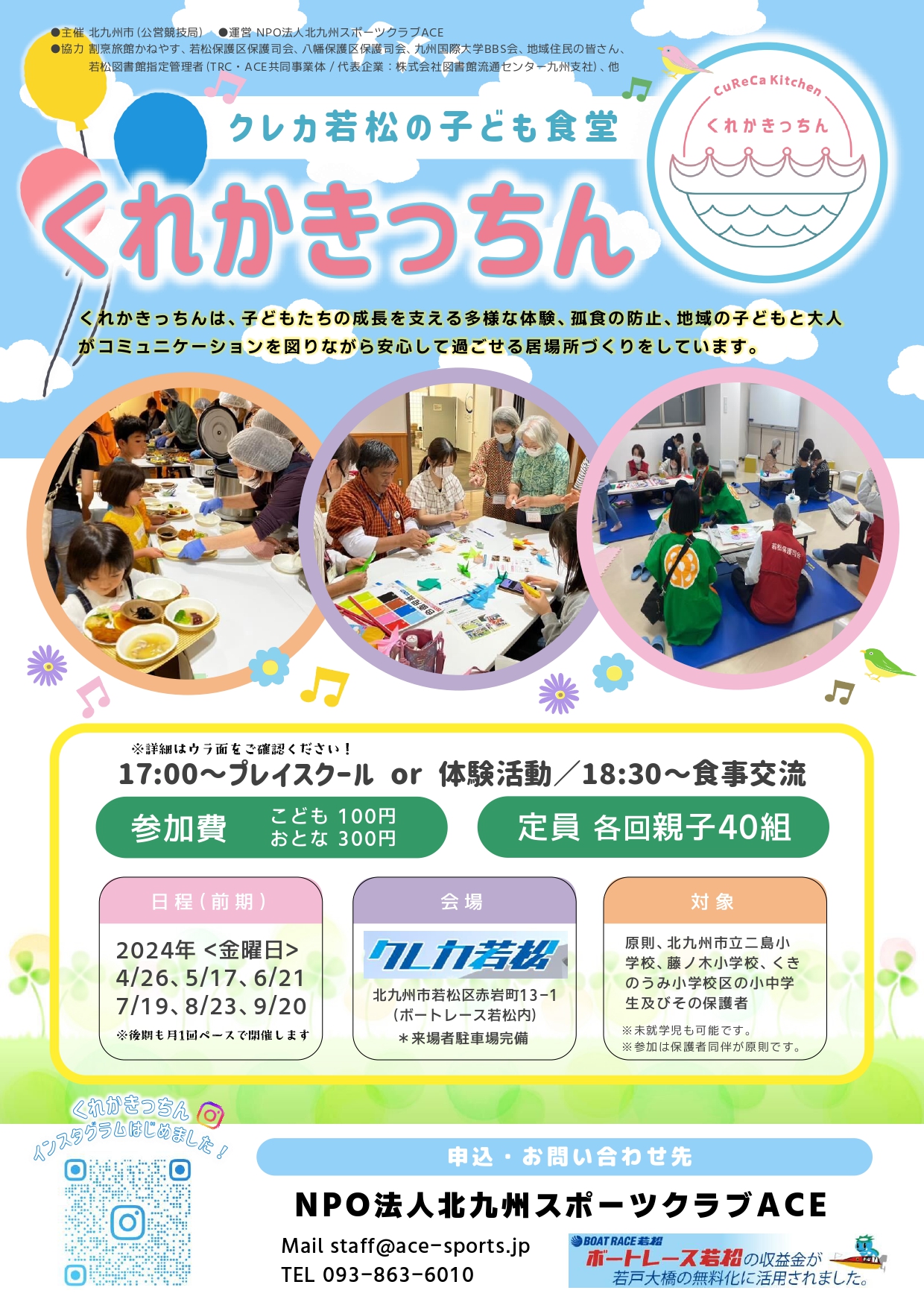 9月20日、クレカ若松で子ども食堂「くれかきっちん」を開催します。令和6年度6回目は昨年好評の「くれか縁日2024」を実施!様々なゲームやお祭り気分を味わえる食事をして、残暑を吹き飛ばしましょう。午後5時から受付開始し、午後8時終了の予定。参加費は、子ども100円、大人300円です。「くれかきっちん」参加には利用登録が必要で、原則、近隣小学校区の小学生とその家族が対象。定員は、親子40組です。完全事前予約制のため、9月17日までメールにて申し込みを受け付けております。ご参加お待ちしています!
