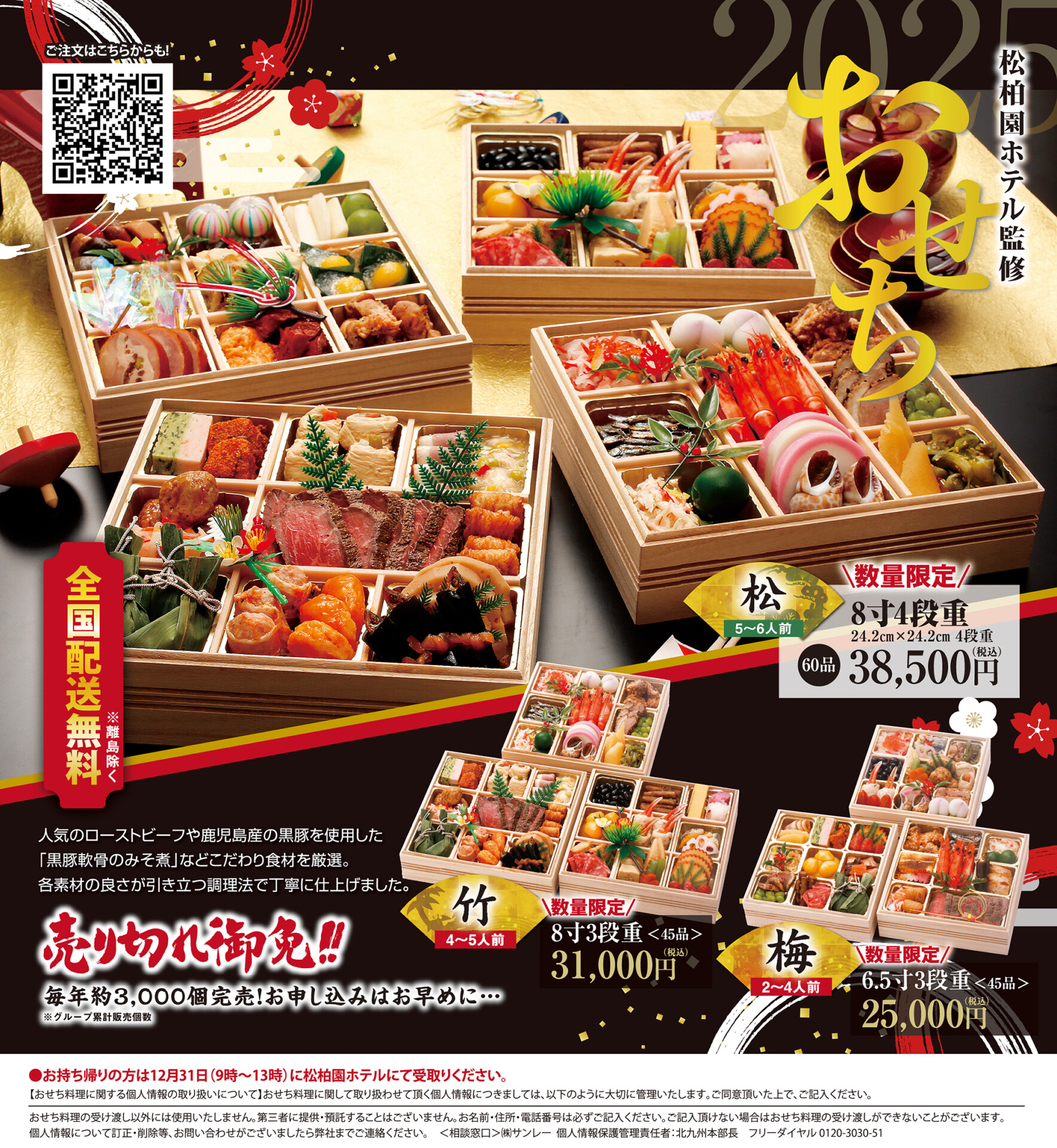 正月を華やかに演出してくれる松柏園ホテル監修の『おせち料理』。こだわりの厳選食材を使用し、丁寧に仕上げたおせち料理は、毎年多くのリピーターにご利用いただいています。今年も人数に応じて選べる3種のおせちをご用意しております。 全国への配送無料(離島除く)数量限定なので、早めのお申し込みがおすすめです。 詳しくは、松柏園ホテルをご覧ください。