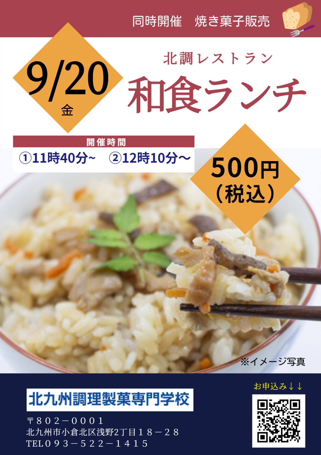 北九州調理製菓専門学校では、9月20日(金)に学生が提供する北調レストランを開催いたします。昨年から大人気の500円ランチ。お子様連れ、お一人様でもご予約可能です。今回はかやくご飯と竜田揚げに副菜とデザートがついた和定食ランチ/500円(税込)となります。定員になり次第締切となりますのでご予約はお早めに。皆様のご予約お待ちしております。