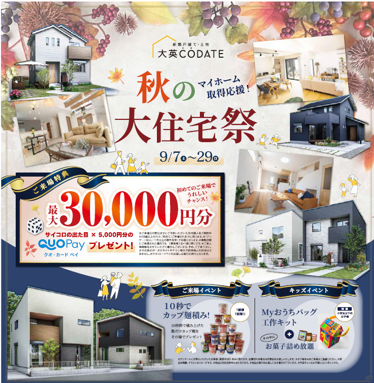大英CODATEでは、9月7日~9月29日の期間中に「秋の大住宅祭」開催しています。期間中は、デザインや生活動線にこだわったさまざまな商品プランをご案内する「個別見学会」やお家探しの基礎知識など、マイホーム探しに役立つ「おうちの無料相談会」を実施しております。