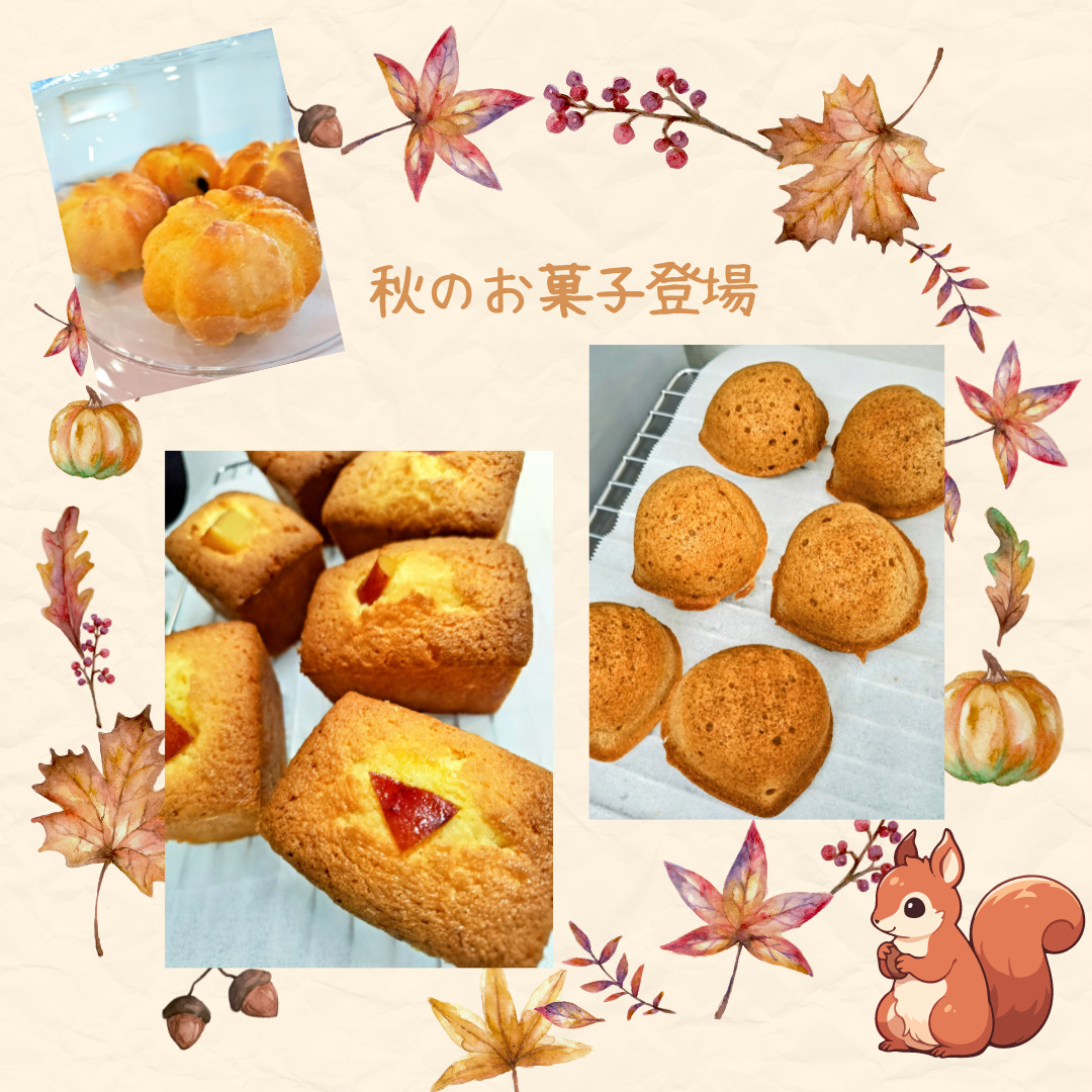 エメージィでは少しずつ秋のお菓子が増えてきています。 「マロングラッセの入ったマロンケーキ」は、ラム酒に漬け込んだグラッセを入れて香り高く焼いてます。マロン型で見かけも可愛いです。かぼちゃを蒸してペーストにした物を生地に混ぜ込んだほんのりシナモン風味の「かぼちゃ型のケーキ」もあります。