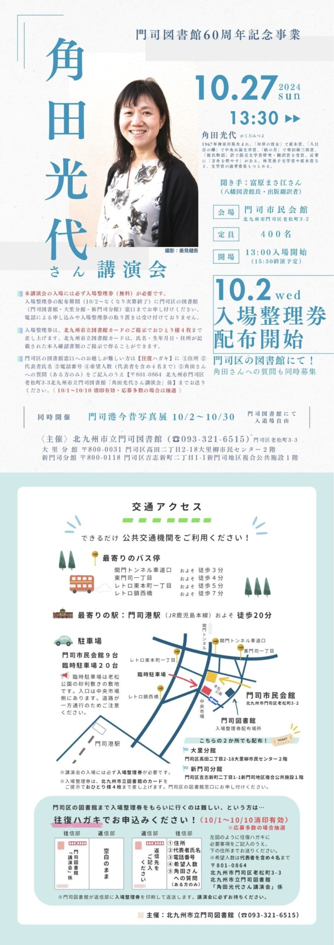 北九州市立門司図書館が現在の老松公園内に開設されてから、今年で60周年を迎えます。それを記念して、同じ老松公園内にある門司市民会館を会場に「角田光代さん講演会」を開催いたします。入場には必ず入場整理券が必要です。門司区の図書館窓口で受け取るか、往復ハガキでお申し込みください。詳細はチラシをご覧ください。お待ちしております。