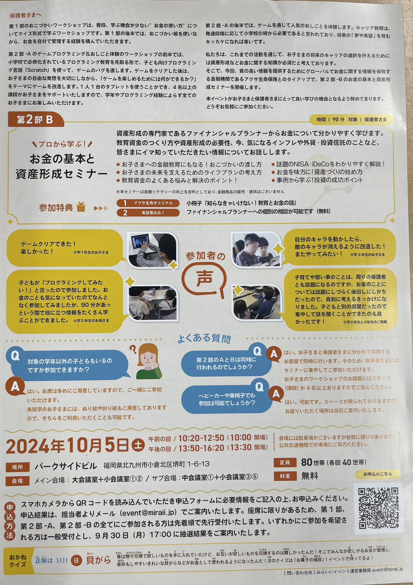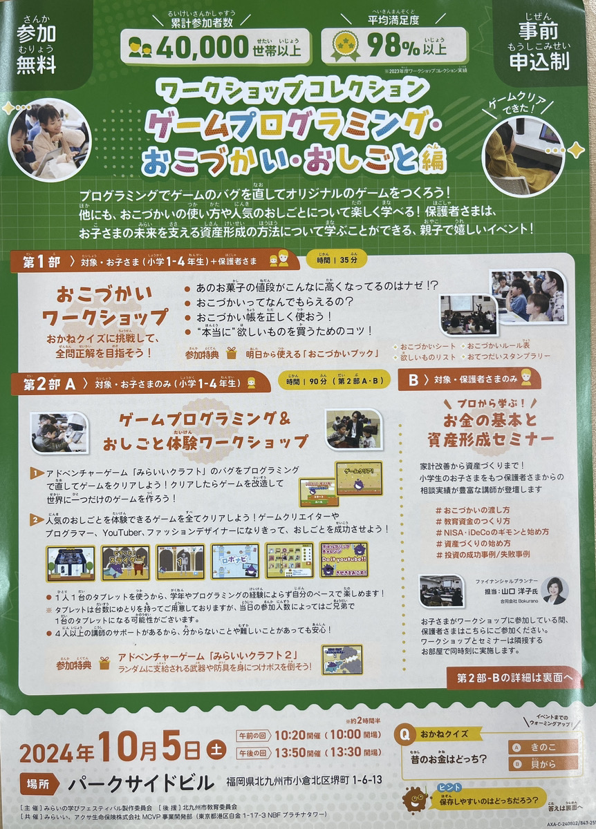 プログラミングでオリジナルゲームを作ったり、おこづかいの使い方や人気のしごとについて学んだりすることができます。また、保護者向けに子どもの未来を支える資産形成のセミナーも実施されます。