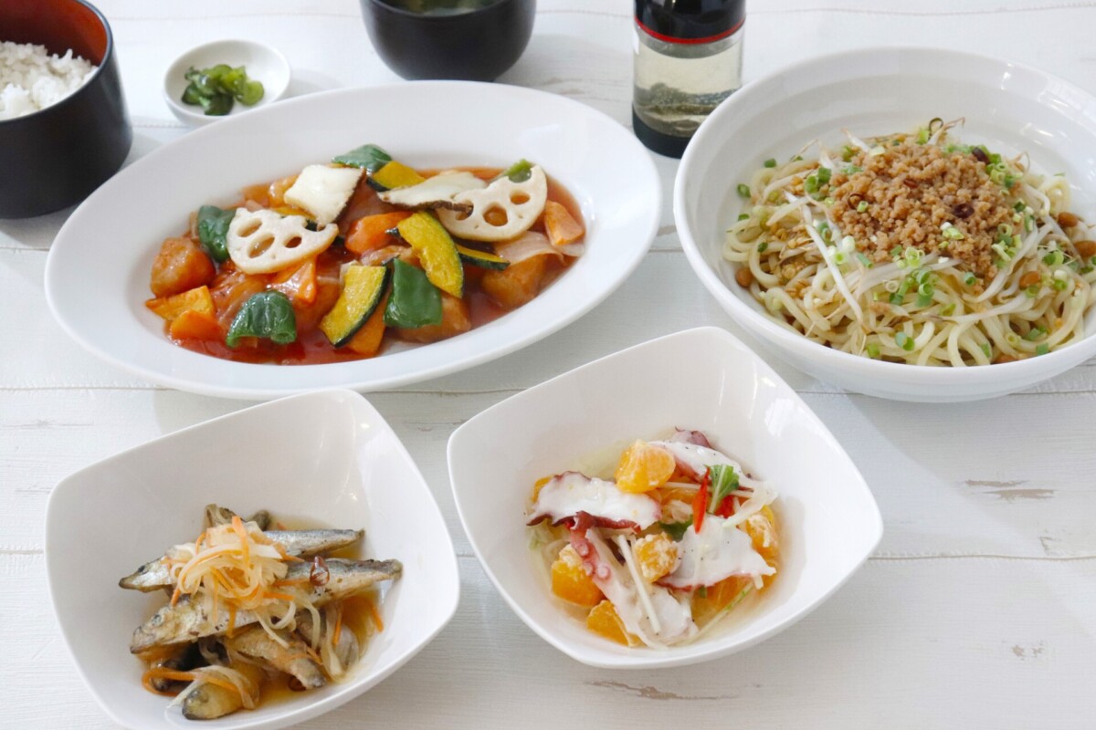 (画像:門司店メニュー例 秋野菜の酢豚定食、まぜそば、イワシの南蛮漬けなど)