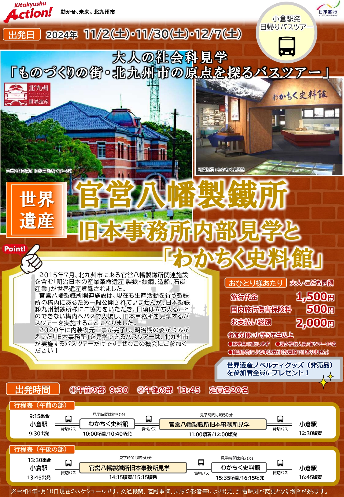 半日コースは日頃立ち入ることができない官営八幡製鐵所関連施設の構内へバスで入場し、旧本事務所の内部を見学するほか、今年は新一万円札の顔・渋沢栄一氏が株主・相談役を務めた若松築港会社の史料館「わかちく史料館」も見学することができます。