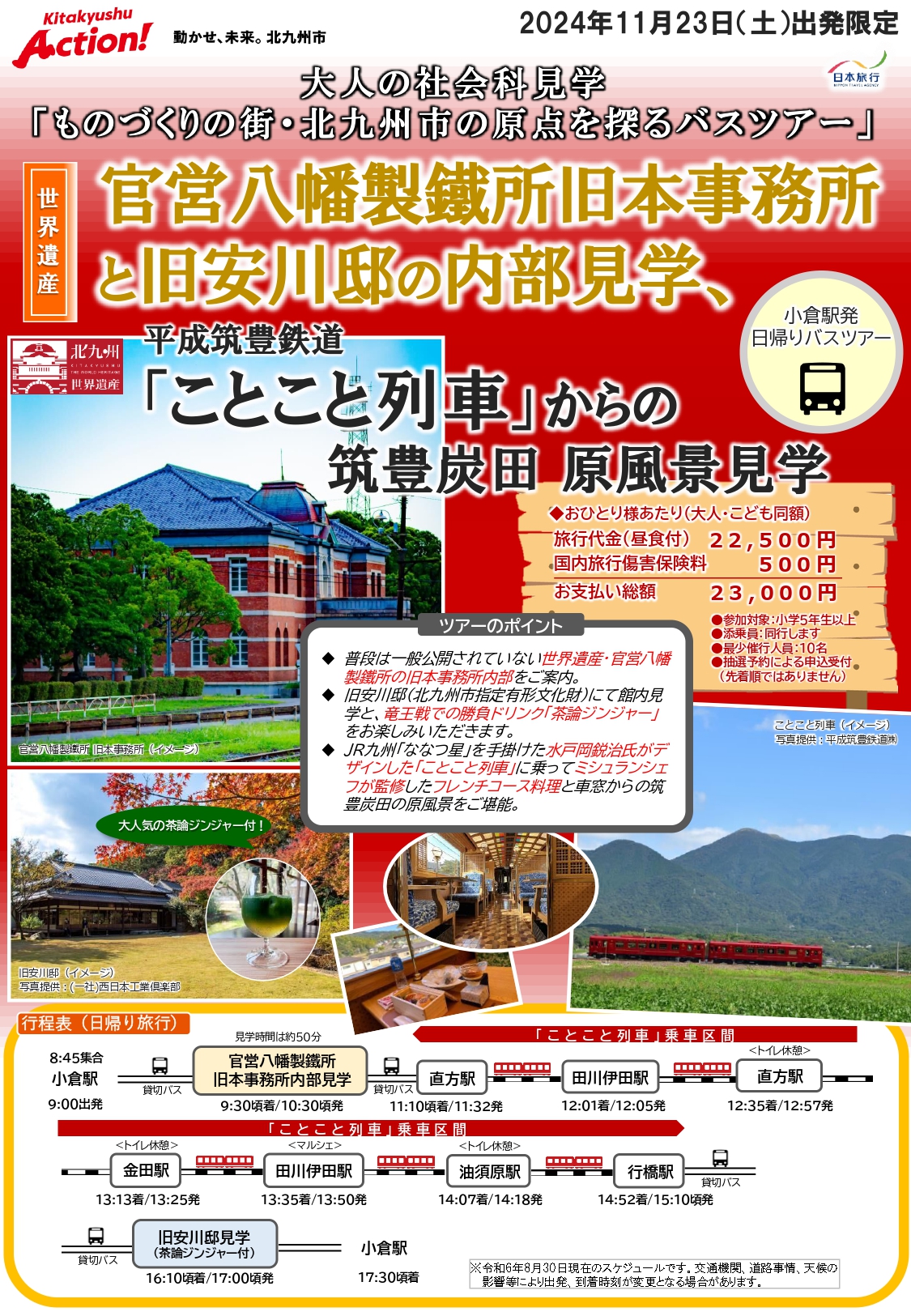 ツアーは「わかちく史料館」を見学する半日コースと、製鉄所の誘致に尽力した安川敬一郎氏の旧宅・旧安川邸と平成筑豊鉄道「ことこと列車」から筑豊炭田の原風景を見学する1日コースの2種類です。