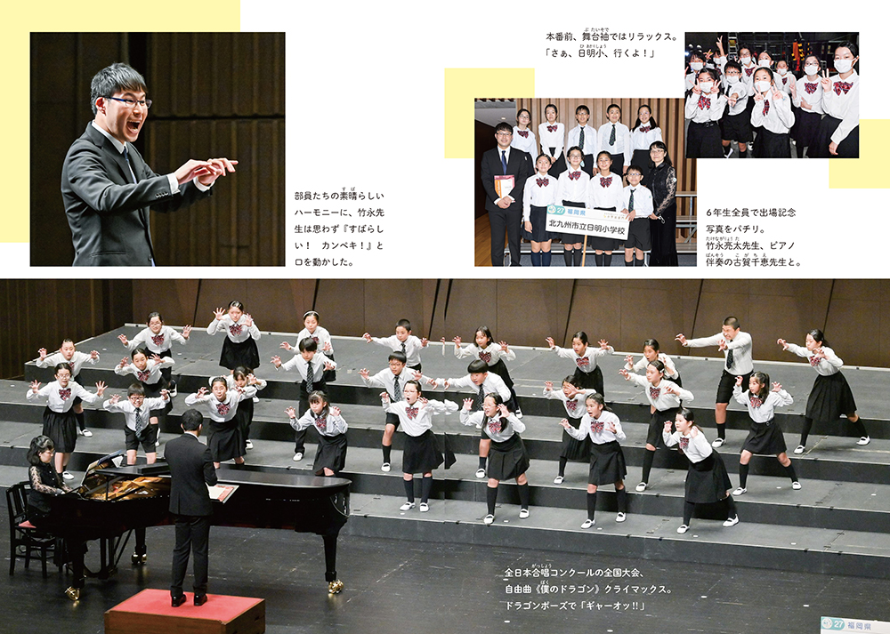 竹永先生は、日明小学校に赴任する前に、偶然合唱部の舞台を見る機会があり、そのときの子どもたちの美しい歌声に感動し、病気でも強く生きていく勇気をもらいました。