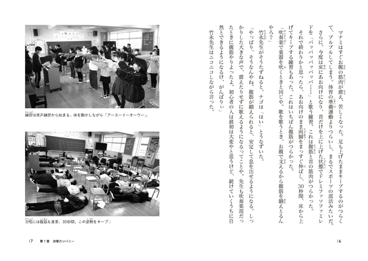 (画像:『とびたて!みんなのドラゴン─難病ALSの先生と日明小合唱部の冒険』中面)同作品は新米顧問の先生と合唱部がコンクールの全国大会金賞をめざす2022年度の1年間の軌跡を描いています。