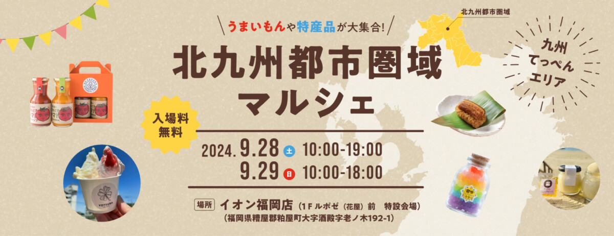 イオン福岡店(福岡県糟屋郡粕屋町大字酒殿字老ノ木192-1)の1階にある花屋・ルポゼ前の特設会場で9月28日と29日の2日間、「北九州都市圏域マルシェ in イオン福岡店」が開催されます。