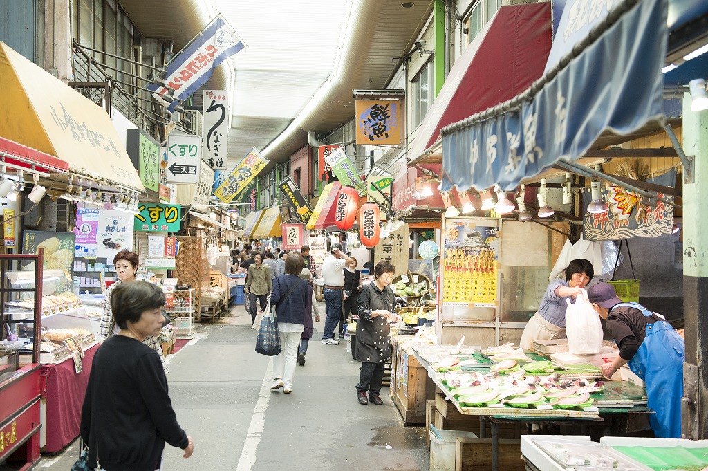 多くの料理人たちも仕入れに訪れるという食材の豊富さはもちろん、建物の多くを占める昭和30年代に建てられた木造建築が市場全体に漂わせる昭和レトロ感も魅力の一つ。映画やドラマなどのロケ地にも使用されるなど、観光地としても親しまれています。