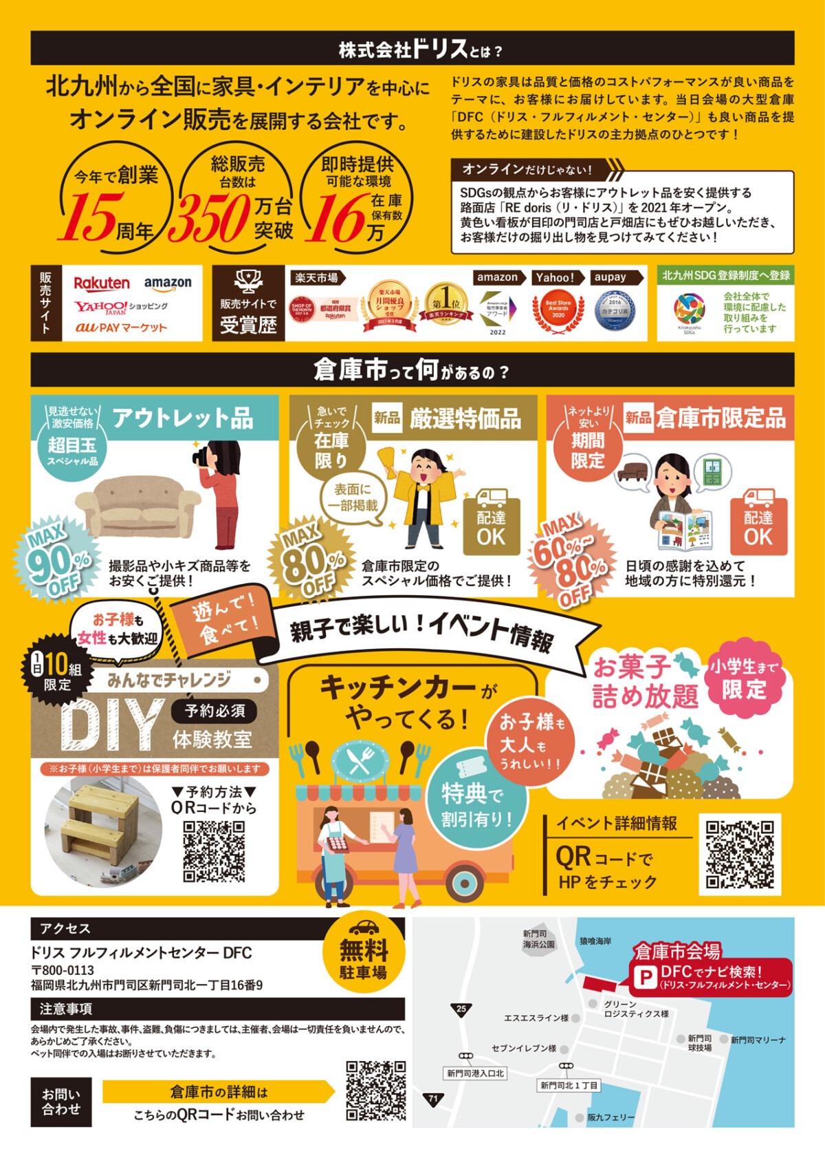 開催場所は同社が運営する新門司の巨大倉庫「ドリス・フルフィルメント・センターDFC」(北九州市門司区新門司北1-16-9)。時間は午前10時から午後5時(4日のみ午後4時まで)の予定です。