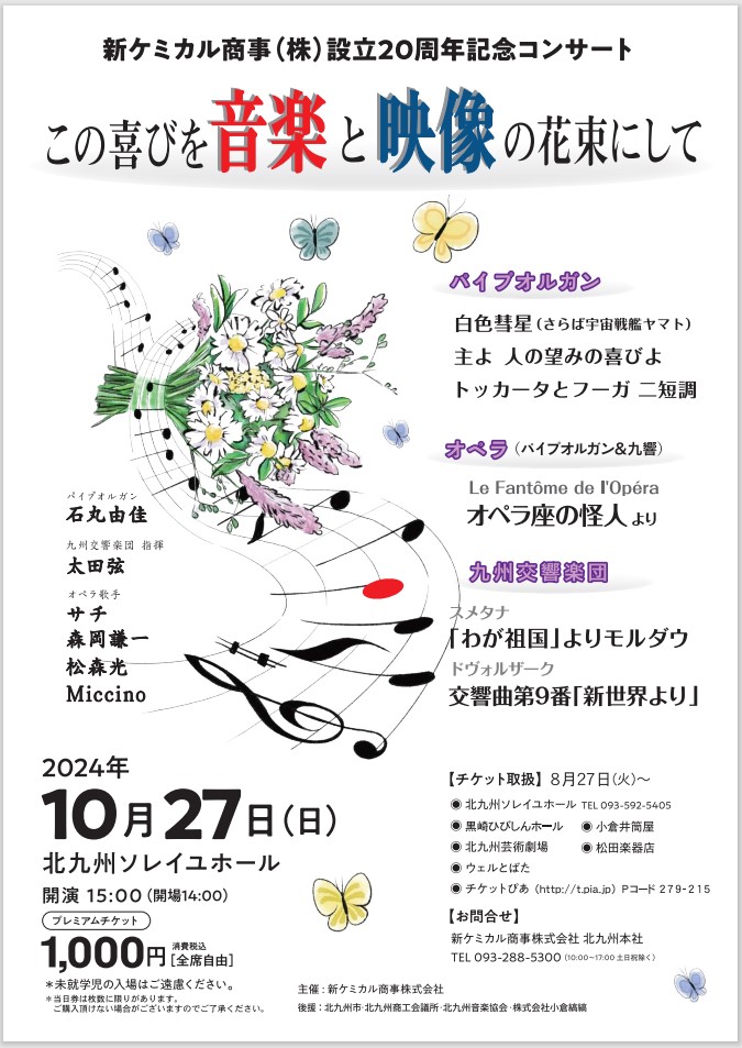 新ケミカル商事株式会社(北九州市小倉北区京町3-1-1 セントシティ北九州8階)はこの度、設立20周年を迎えました。これを記念して10月27日、多くの皆様への感謝を込めたクラッシックコンサート「この喜びを音楽と映像の花束にして」を北九州ソレイユホールで開催します。
