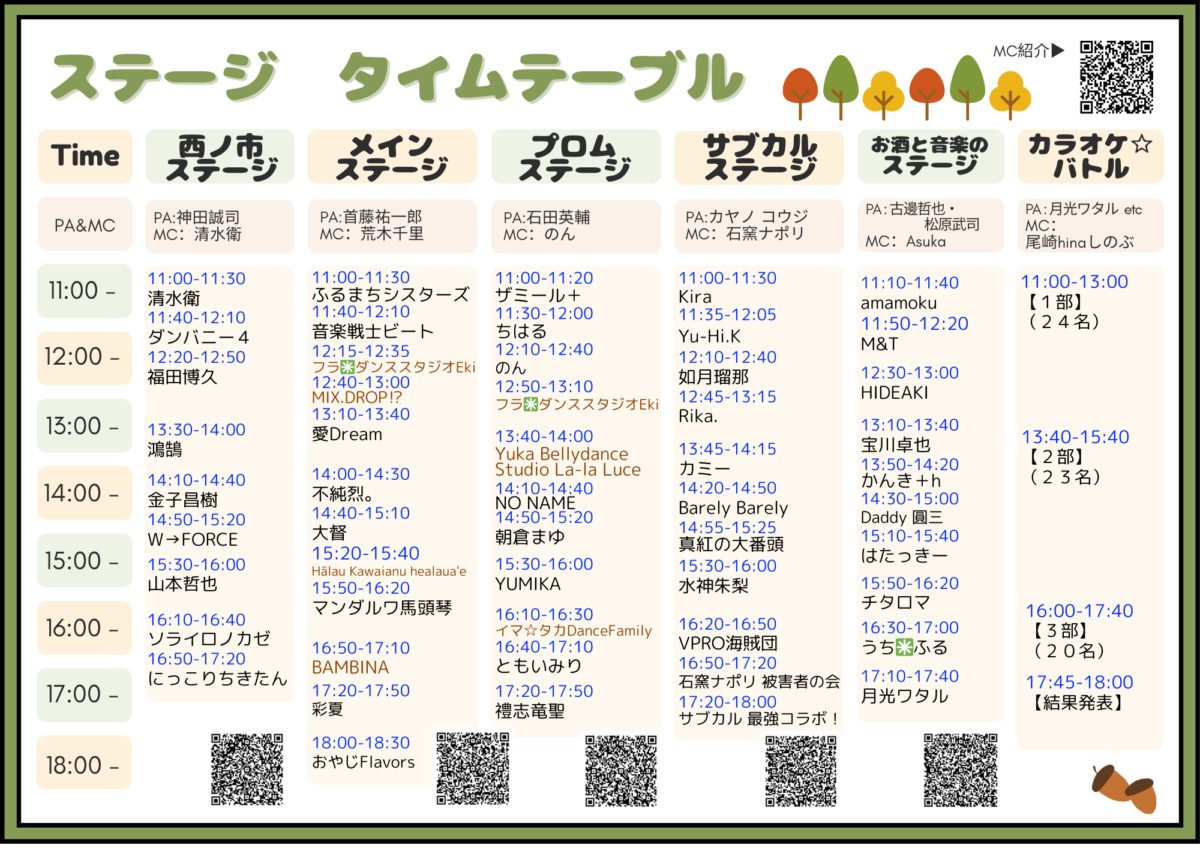 西ノ市ステージ・メインステージ・プロムステージ・サブカルステージ・お酒と音楽のステージでは、音楽に関する様々な催しが行われます。