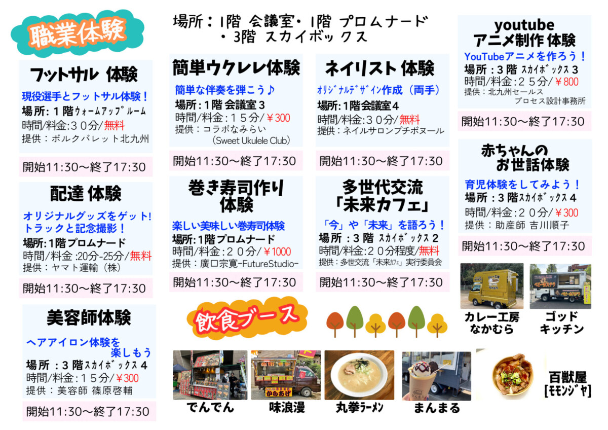 職業体験・アンパンマンふあふあ・ヒーローショー・バルーンアートといった子どもが喜びそうなイベントも充実。キッチンカー・BBQ・角打ち音楽バーなどのグルメも堪能できるそうですよ。なお、BBQと角打ち音楽バーは予約制となっています。
