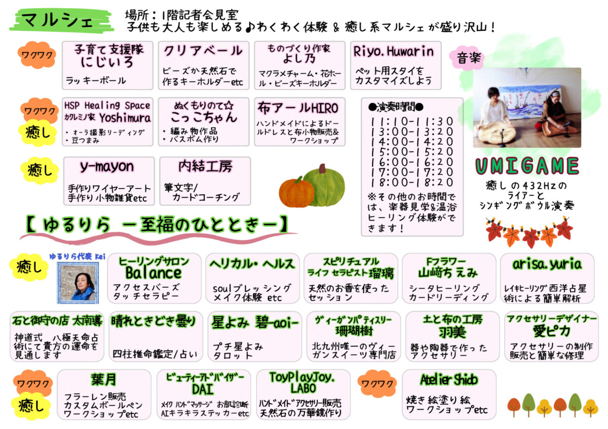 また、“わくわくものづくり体験マルシェ”や“癒し系マルシェ”のほか、スイーツや占い、アクセサリーなど幅広く楽しめる内容になっています。