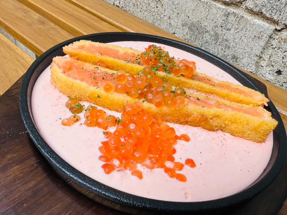 「サーモンカツレツの明太子クリームチーズ(2280円)」は、明太子とクリームチーズのピンクソースで見た目も華やかです。