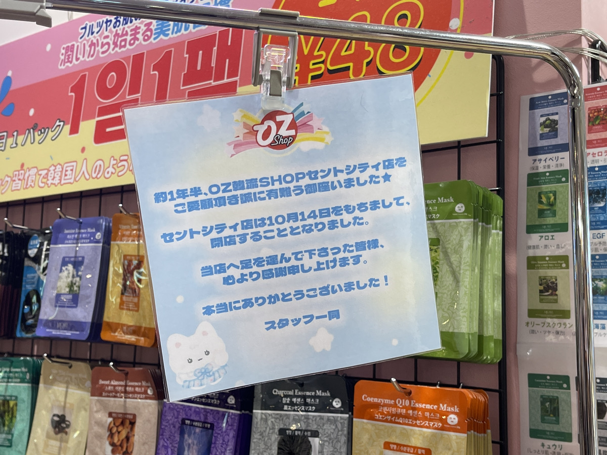 韓国グッズを扱う店「OZ韓流SHOPセントシティ店」が10月14日に営業を終了しました。