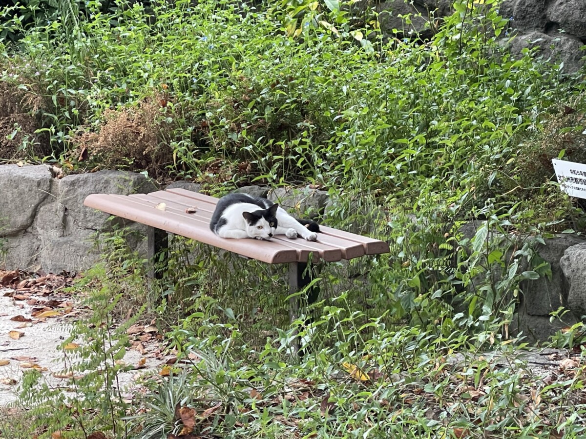 ベンチでは猫が休憩。こちらの様子を伺っているようでしたが、近くによっても離れません。