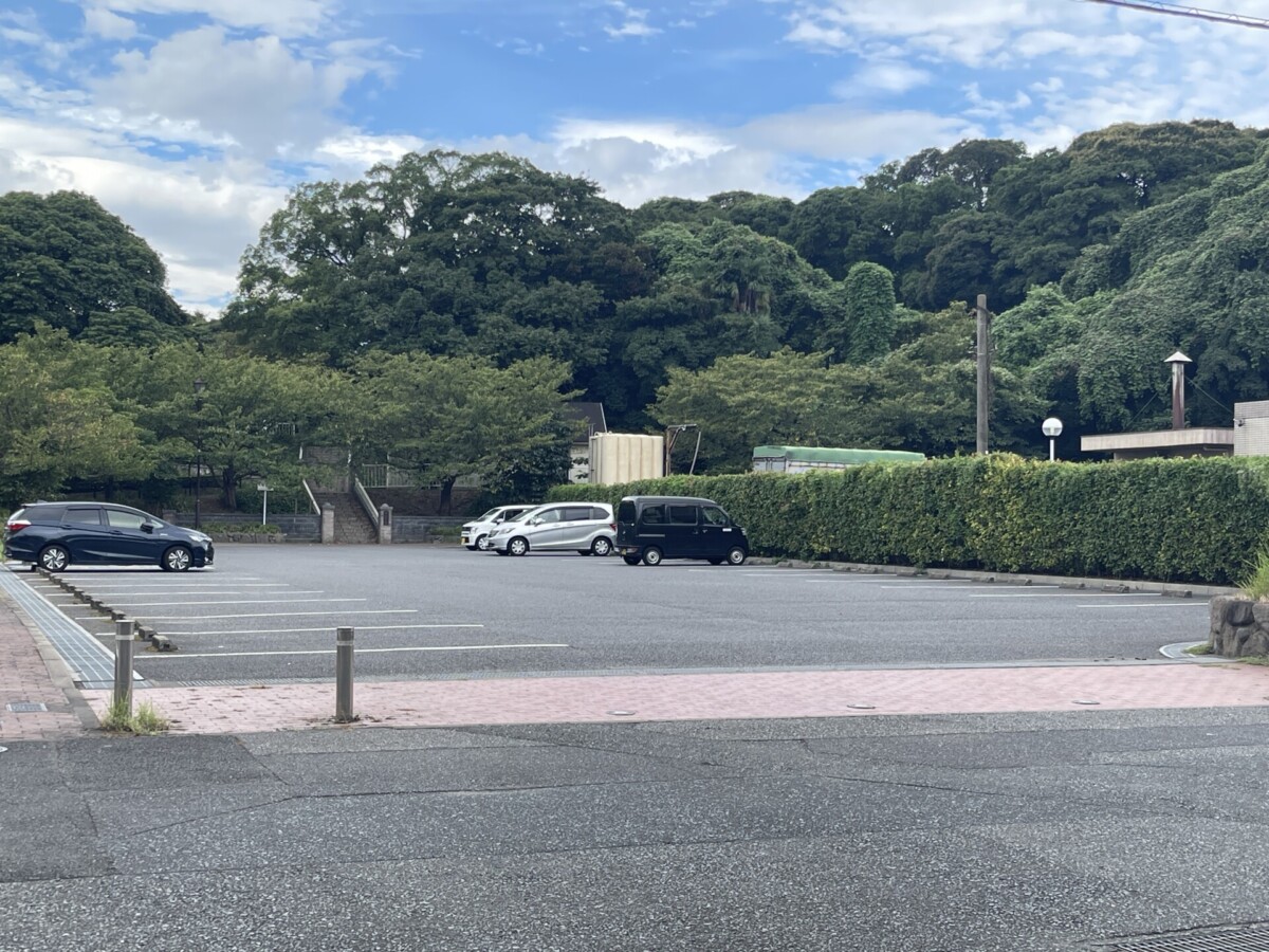 看板の矢印の通り左に曲がるとすぐ公園の駐車場があります。10台以上あり、無料で利用できました。