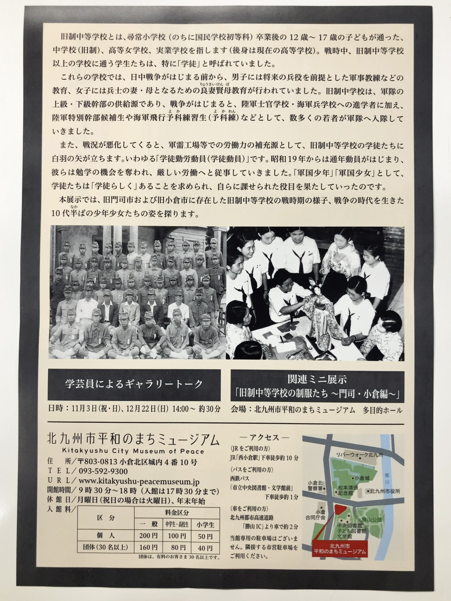 同展示では、旧門司市および旧小倉市に存在した旧制中等学校の戦時期の様子、戦争の時代を生きた 10代半ばの少年少女たちの姿を探っています。