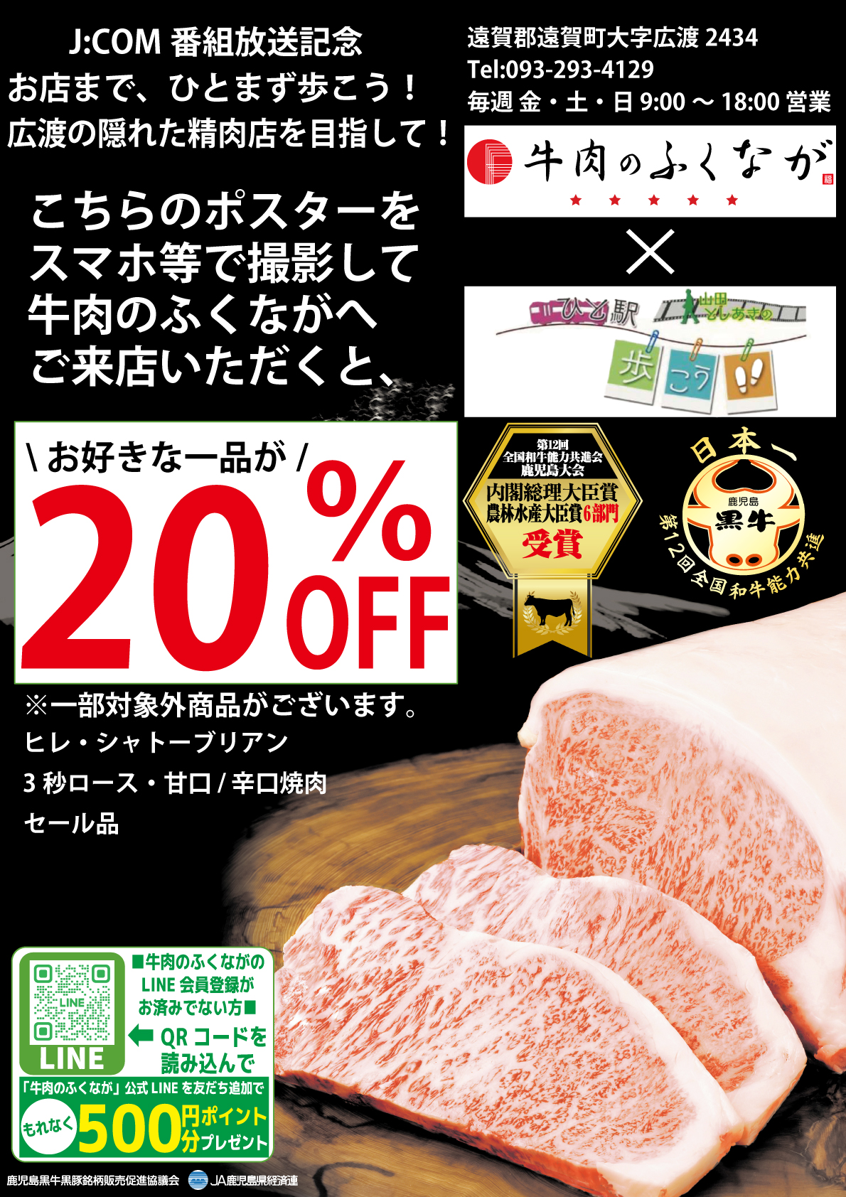 また、“本当にJR遠賀川駅から歩いてやってきたお客様限定”で、遠賀川駅にて「牛肉のふくなが」と「山田としあきのひと駅歩こう」コラボ企画のポスターを写真で撮ってInstagramに投稿したお客様は、お好きな商品を1品20%割引します(一部対象外商品もあり)。