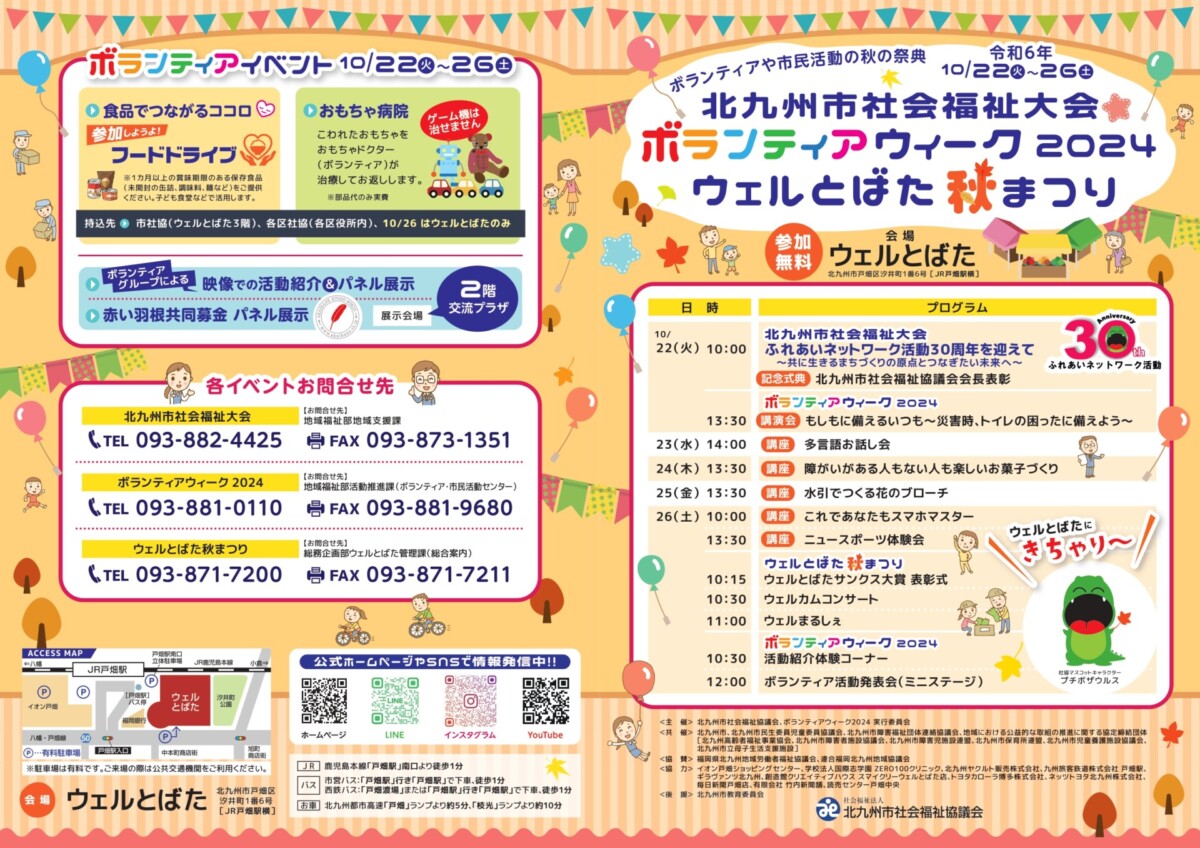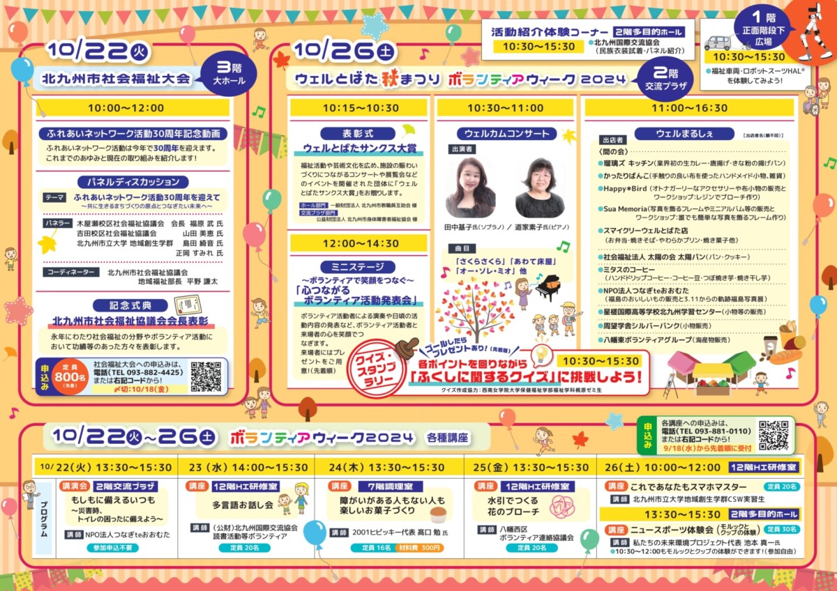 また、10月22日から26日の期間中は「ウェルとばた秋まつり」にあわせて、「北九州市社会福祉大会」や「ボランティアウイーク2024」も同時開催し、記念講演や講演会、各種講座も行われます。なお、講座などは先着順のため受付が終了している場合があります。
