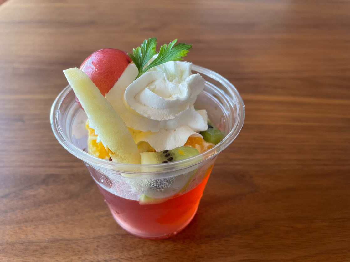 「サバ缶カレー」の食後にぜひ食べたいのが、お店のおすすめ商品でもある「フルーツジュレ」。透明感があり、綺麗な色をしたジュレにたくさんの果物が載っています。