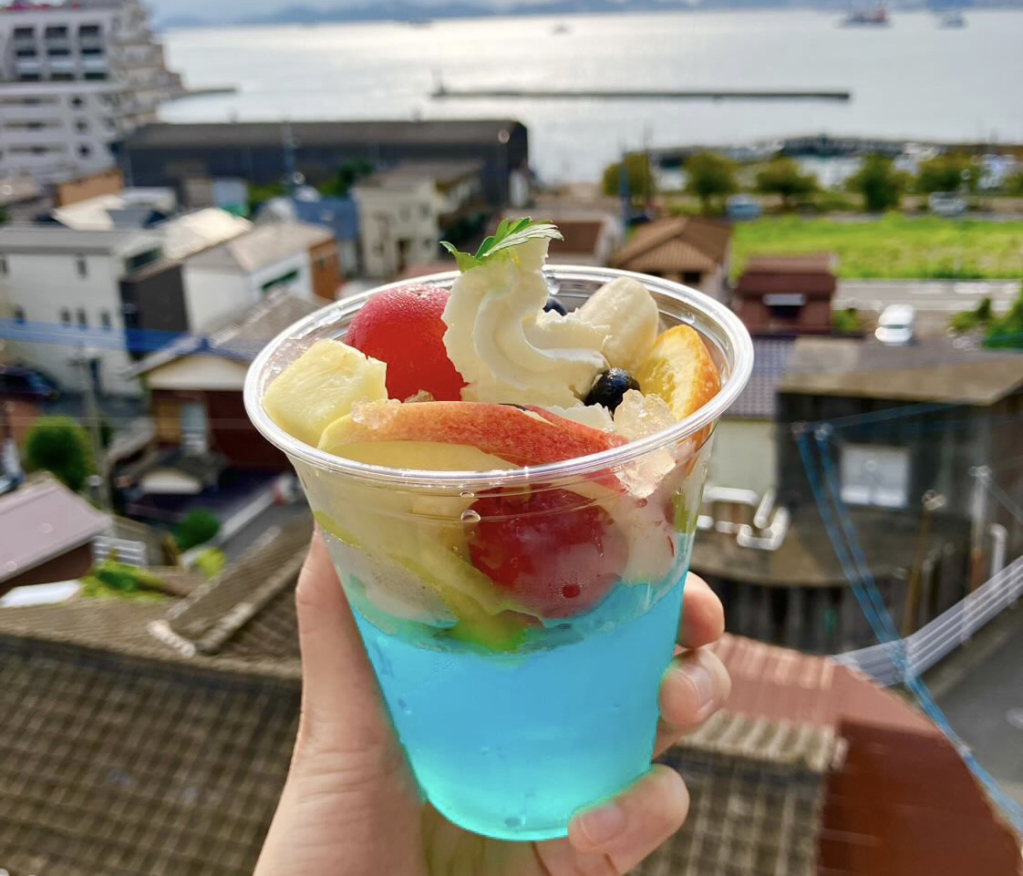 また、日曜日限定のフルーツジュレもあるのだとか。10月に新登場したのは、晴れた日の関門海峡の海と行き交う貨物船をイメージした爽やかな水色のジュレをベースにしています。