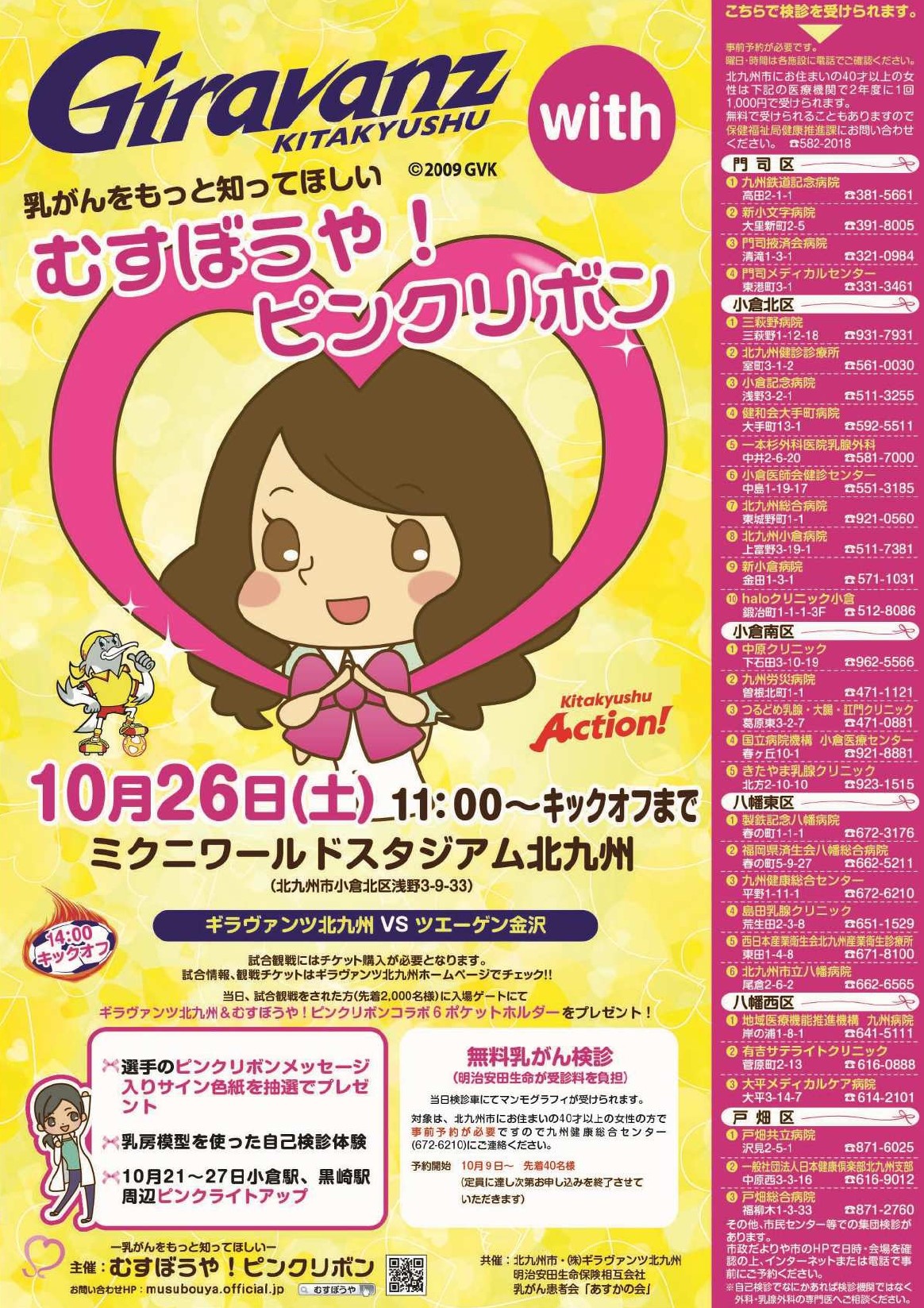 なお当日は、午後2時よりミクニワールドスタジアム北九州でギラヴァンツ北九州対ツエーゲン金沢の試合が行われます。観戦した先着2000人には「ギラヴァンツ北九州&むすぼうや!ピンクリボンコラボ6ポケットホルダー」がプレゼントされるそうです。