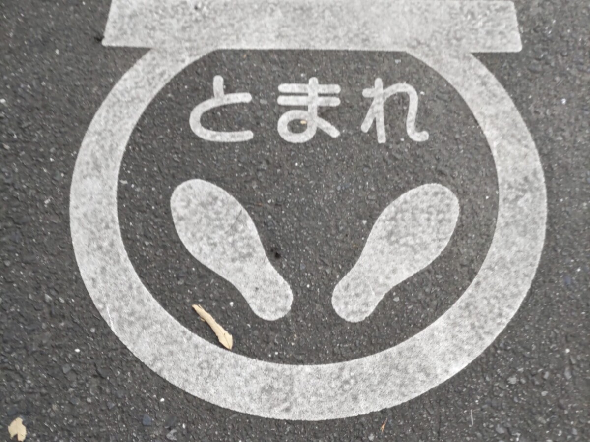 また、この緑地帯横の歩道は通学路でもあるため、「とまれ」の文字と足型のマークが歩道に書かれています。これに促されるように、自然と足が止まります。