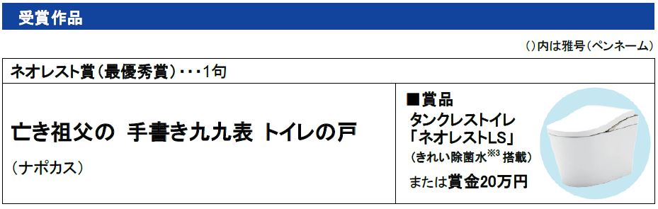 最優秀賞のネオレスト賞は「亡き祖父の 手書き九九表 トイレの戸」に決定。また、第20回の開催を記念して設けられた「トイレ川柳20回記念」賞には、「川柳が くれるトイレと 向き合う日」が選ばれました。