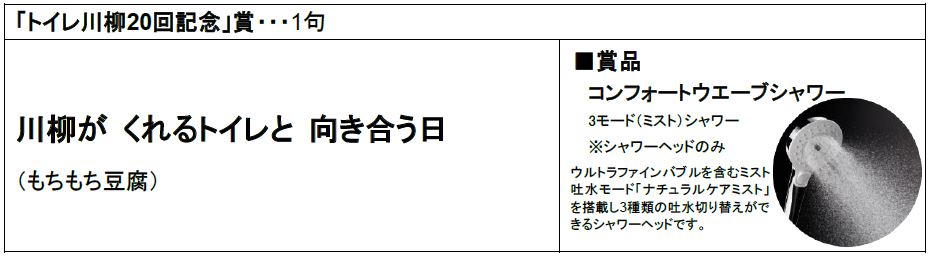 佳作を除く受賞20句については、トイレットペーパー型川柳集『第20回トイレ川柳大賞』に掲載し、11月10日のトイレの日に発行予定です。