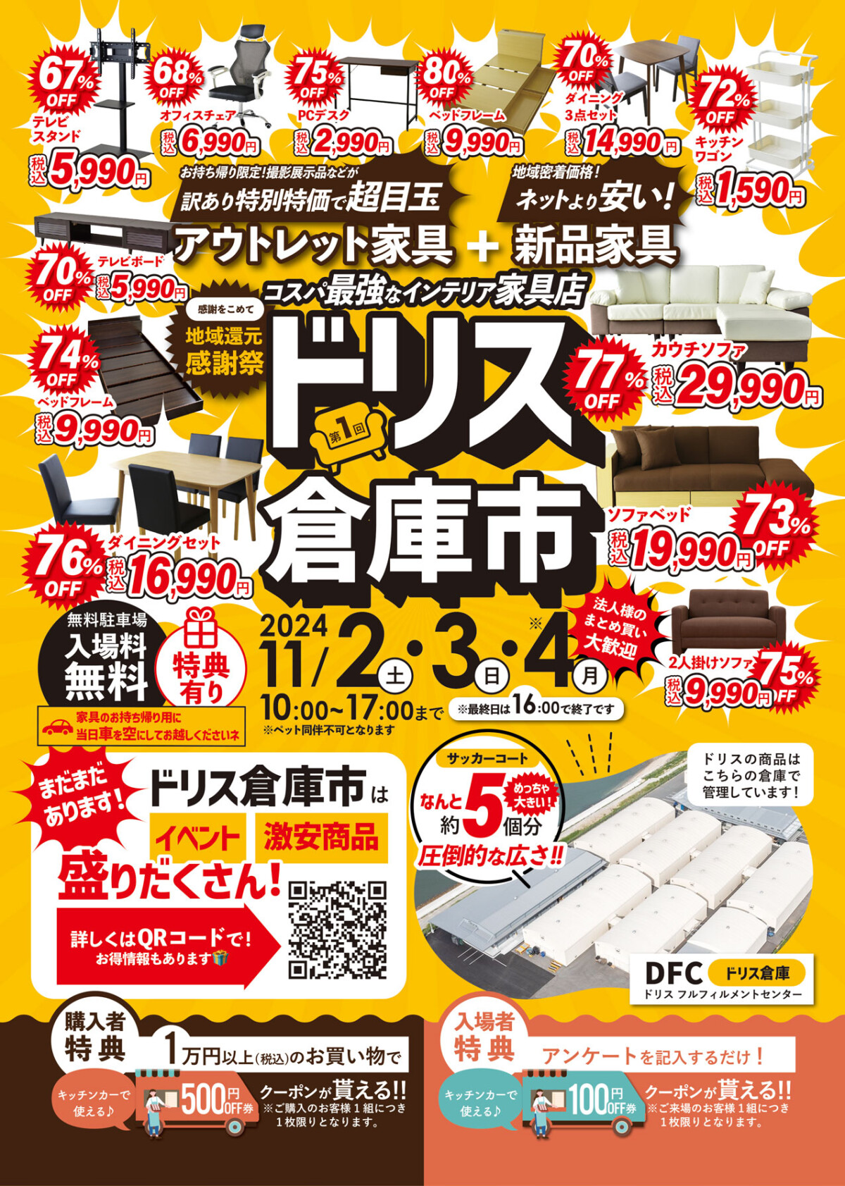 インテリア家具などを扱う株式会社ドリスは11月2日〜4日の期間、アウトレット家具や新品家具などをリーズナブル価格で販売する「ドリス倉庫市」を開催します。