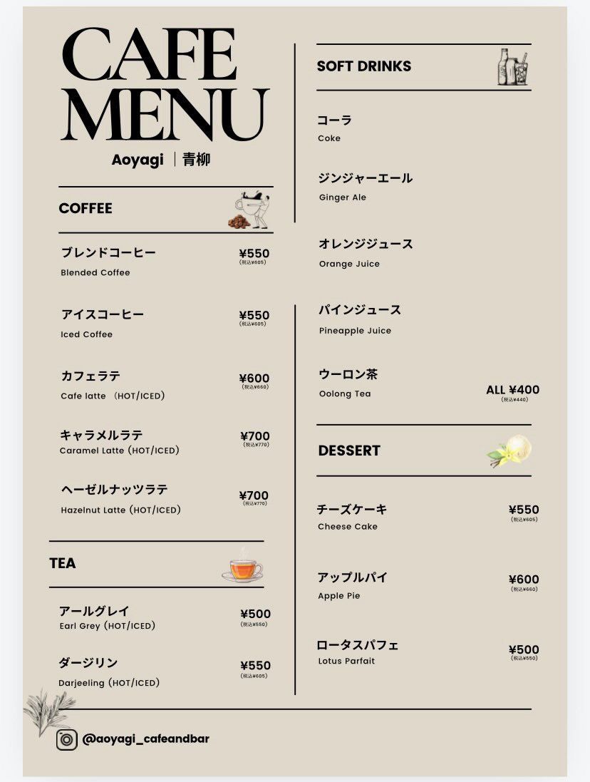 詳細は、「Cafe&Bar Aoyagi|青柳」のインスタグラムで確認できます。