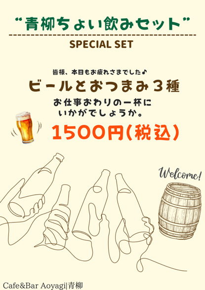 さらには、生ビールとおつまみ3種類がついた「青柳ちょい飲みセット」もあり、ランチタイムやカフェタイムとは違った雰囲気も感じられそうです。