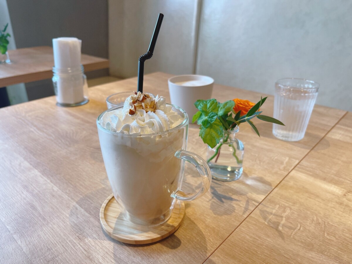 同行した知人が注文したのは、「ブレンドコーヒー」と「ヘーゼルナッツラテ」。ヘーゼルナッツラテは、手持ちのある高いグラスにふわふわとホイップクリームが載せてあり、上にはナッツが散らしてありました。