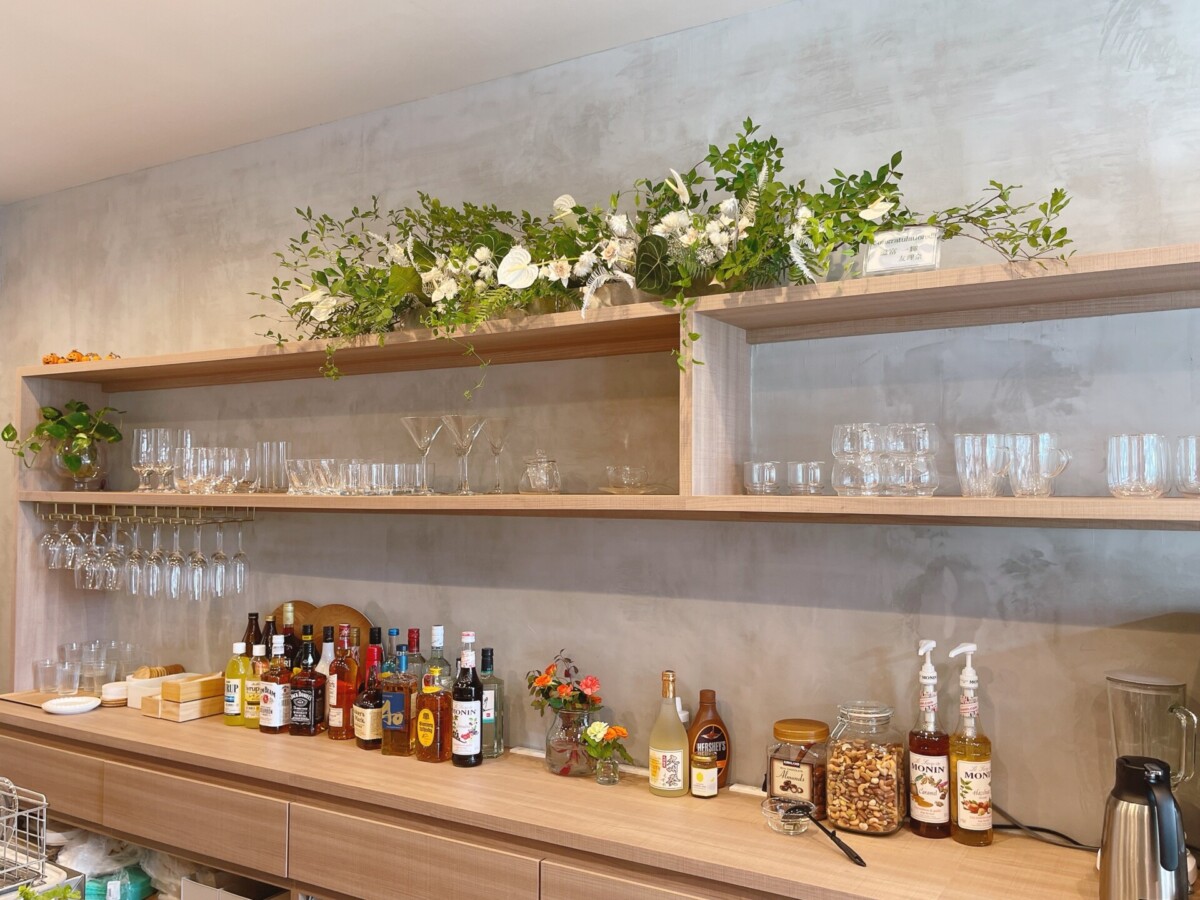 カウンター席の向こう側には、色々な種類のグラスやシロップ、Barタイムに使用されるリキュールなどが並んでいます。