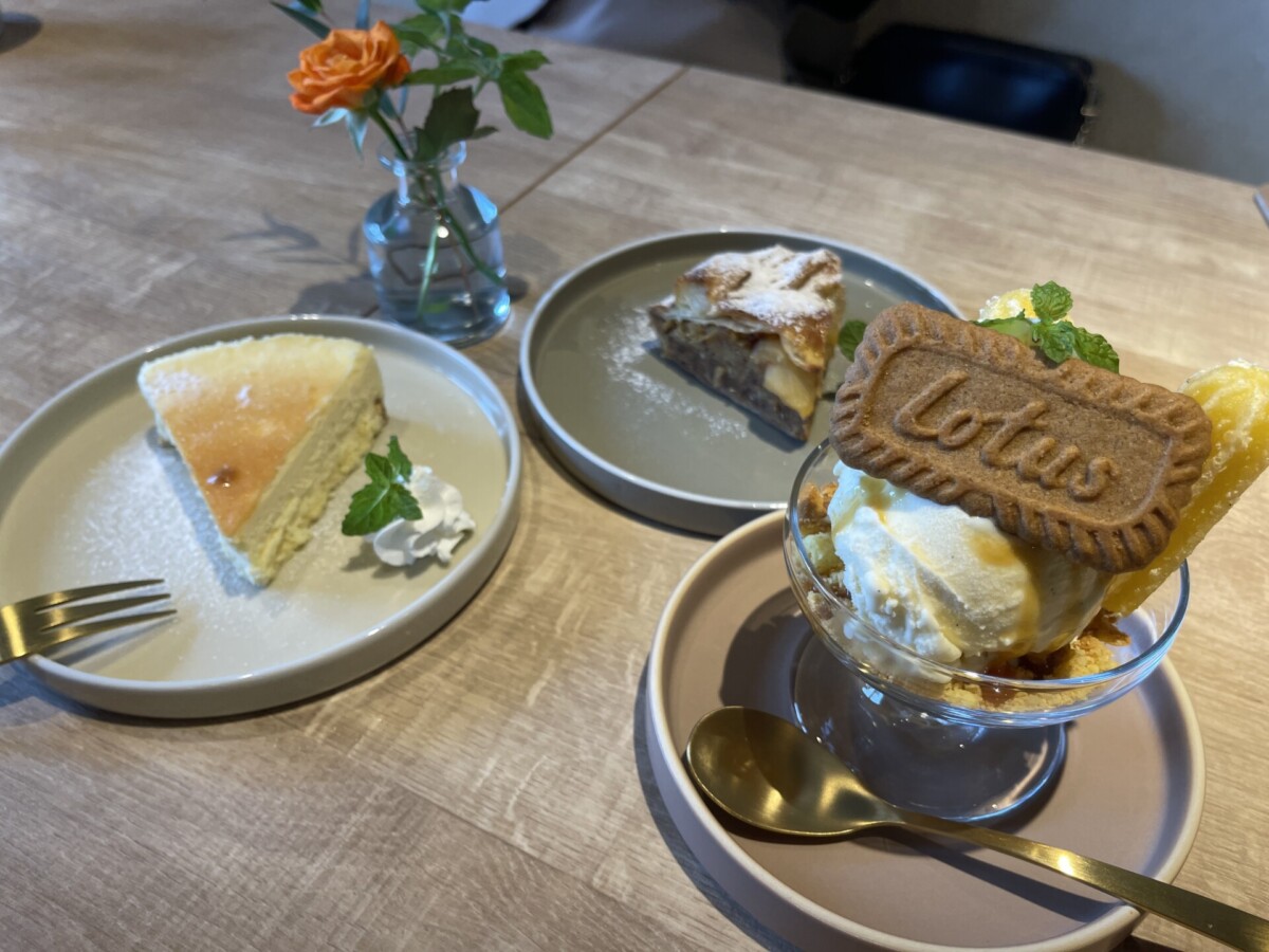 スイーツはロータスパフェとチーズケーキ、アップルパイをそれぞれ注文。