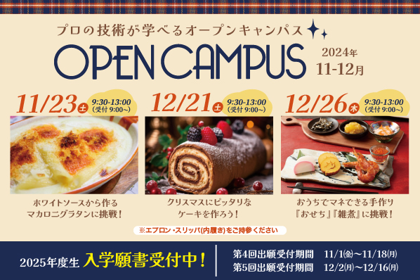 北九州調理製菓専門学校は、北九州市の専門学校で唯一の調理師免許が取得できる養成施設です。調理師科1年コースは10代~60代までの幅広い方が一緒に学び、調理師を目指しています。オープンキャンパスでは学校説明や調理実習の体験もできます。個別のご相談もお気軽にお声掛けください。皆さんのご予約お待ちしております。