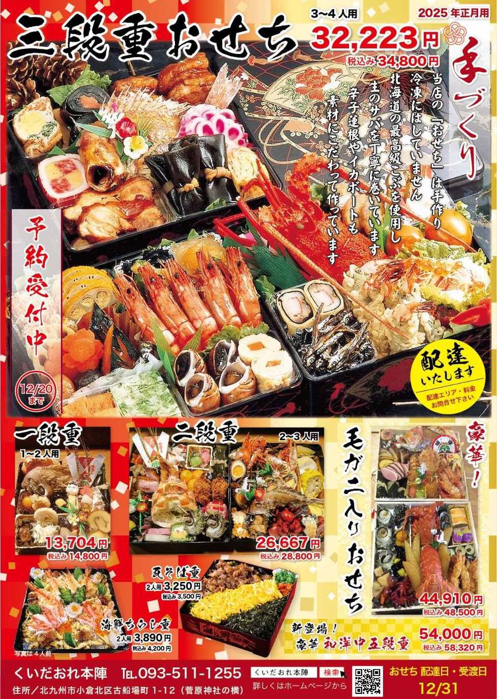 「くいだおれ本陣」では、2025年お正月向けに贅沢なおせち料理の予約受付中です。北海道産の厳選昆布を使用したさばの昆布巻きなど手作りにこだわったおせちは、家族や大切な人と過ごすお正月を華やかに彩ります。1〜2人用や2〜3人用のセットもあり、ニーズに合わせて選べます。配送エリア内なら配達も可能で、予約は12月20日まで。数量限定のため、早めのご予約をおすすめします。